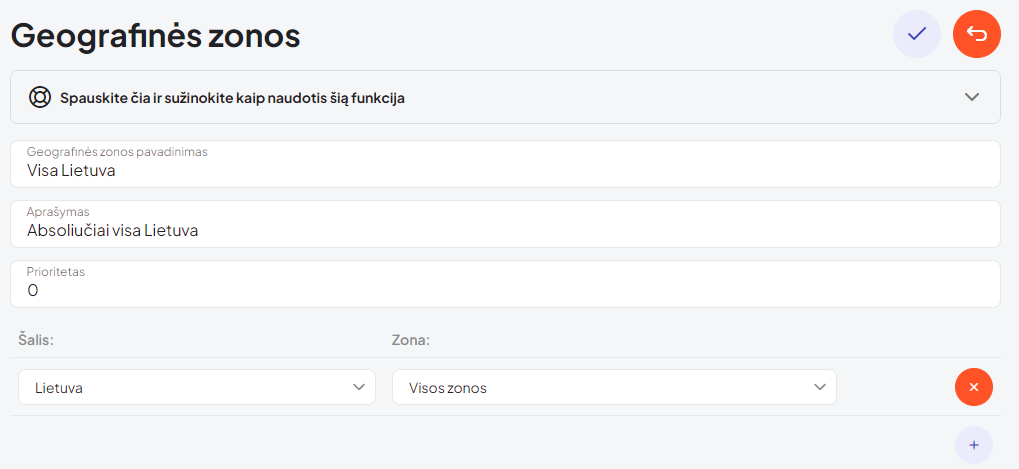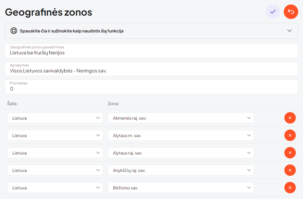 Į zoną galite pridėti šalis ir jų regionus – po vieną eilutę kaip visą šalį su visomis zonomis (regionais), arba keletą eilučių tik su tam tikrais regionais.