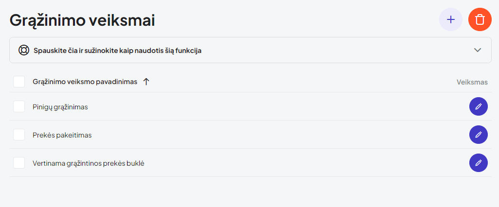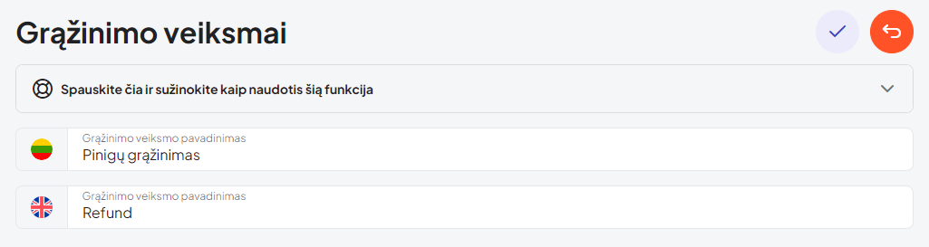 Grąžinimo veiksmus galite pridėti, pakeisti ir prižiūrėti Lokalizacija > Grąžinimai > Grąžinimų veiksmai