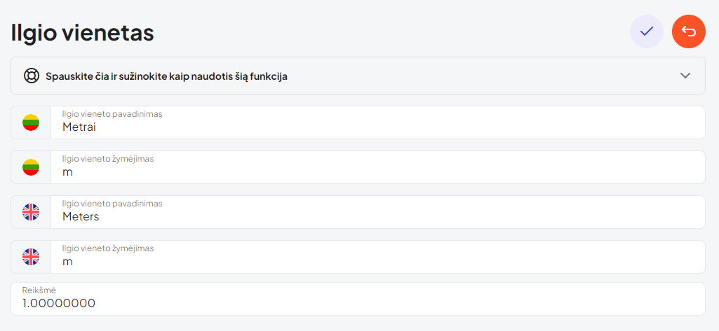 - Įrašykite ilgio vieneto reikšmę – pagrindiniam vienetui tai bus 1.