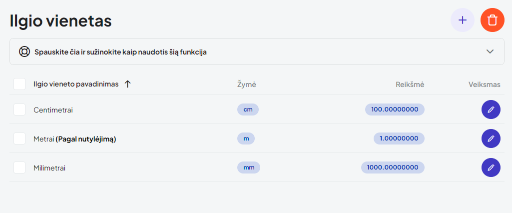 Jei kuriamas papildomas ilgio vienetas – jo reikšmė turi atitikti pagrindinio jūsų parduotuvės ilgio vieneto santykį, pvz. jei kuriame centimetrą, o parduotuvės pagrindinis matavimo vienetas yra metras – centimetro reikšmė turi būti 0.01.