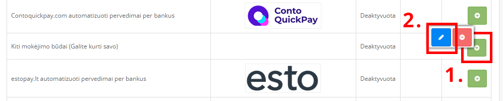 1. Parduotuvėje keliaujame į Nustatymai > Atsiskaitymo būdai. Randame modulį „Kiti mokėjimo būdai (Galite kurti savo)“, jei modulis nebuvo nė karto naudotas – įdiegiame jį žaliu mygtuku su pliuso simboliu  [1]. Įdiegus modulį, jo valdymo eilutėje atsiranda mėlynas redagavimo mygtukas su pieštuko simboliu – spaudžiame redaguoti [2].