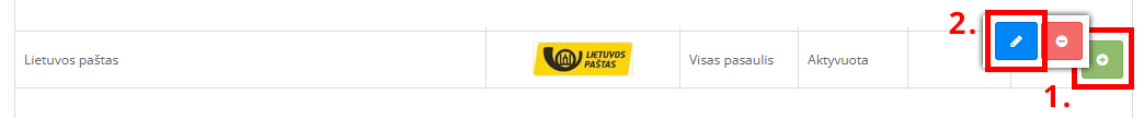 Keliaujame į Nustatymai > Pristatymo būdai ir pasirenkame Lietuvos paštas. Jei integracija dar nė karto nebuvo naudota, aktyvuojame žaliu mygtuku su pliuso simboliu [1.], vėliau įjungiame redagavimą / valdymą mėlynu mygtuku su pieštuko simboliu [2.].