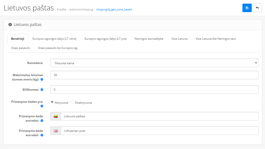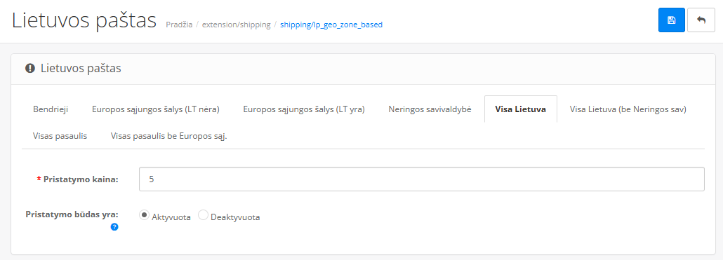 Pasirinkus fiksuotą kainą kiekvienai geografinei zonai tiesiog įveskite norimą šio pristatymo kainą klientams – jei esate PVM mokėtojai, kainą nurodykyte be PVM. Nepamirškite aktyvuoti pristatymo šiai zonai.