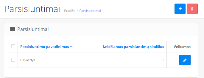 Norint įkelti tam tikrus dokumentus ar pačias, skaitmenines prekes, kurias klientas galės matyti ir gauti tik sėkmingai nupirkęs – juos pradžiai reikia įkelti į sistemą tam skirtoje vietoje Prekių valdymas > Parsisiuntimai. Atsidariusiame lange matysite parsisiuntimų sąrašą, mėlynu mygtuku su pliuso simboliu – pridėsite naują atsisiuntimą. Pažymėję esamą atsisiuntimą žymele kairėje pusėje ir spustelėję raudoną šiukšliadėžės simbolį – pašalinsite esamą parsisiuntimą (sistema pašalinti neleis jei parsisiuntimas bus priskirtas prekėms). Paspaudę mėlynos spalvos mygtuką su pieštuko simboliu (kiekvienoje eilutėje, šalia esamo parsisiuntimo) – galėsite pakeisti parsisiuntimo duomenis.