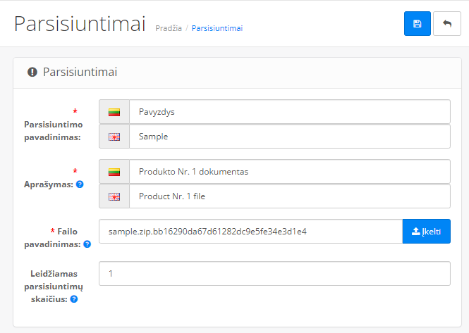 - Leidžiamas parsisiuntimų skaičius – į šį laukelį įveskite kiek kartų vienas klientas gali atsisiųsti tą patį parsisiuntimą.