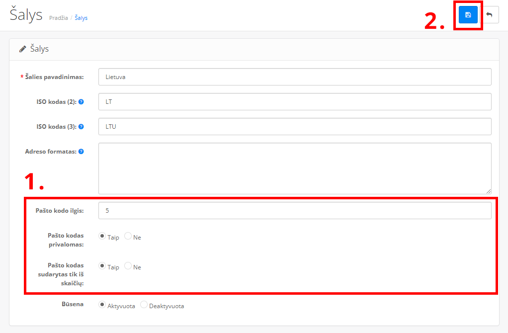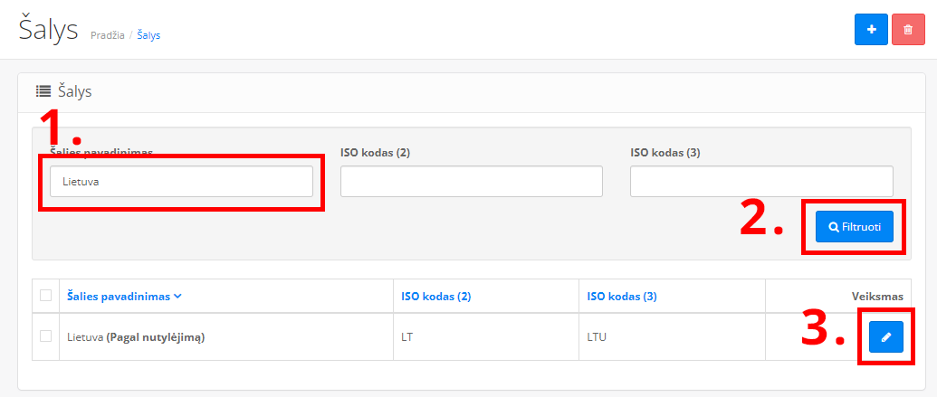 Keliaujame į skiltį Lokalizacija > Šalys ir randame norimą – šiuo atveju įveskime Lietuva. Spaudžiame mėlynos spalvos redagavimo mygtuką su pieštuko simboliu.