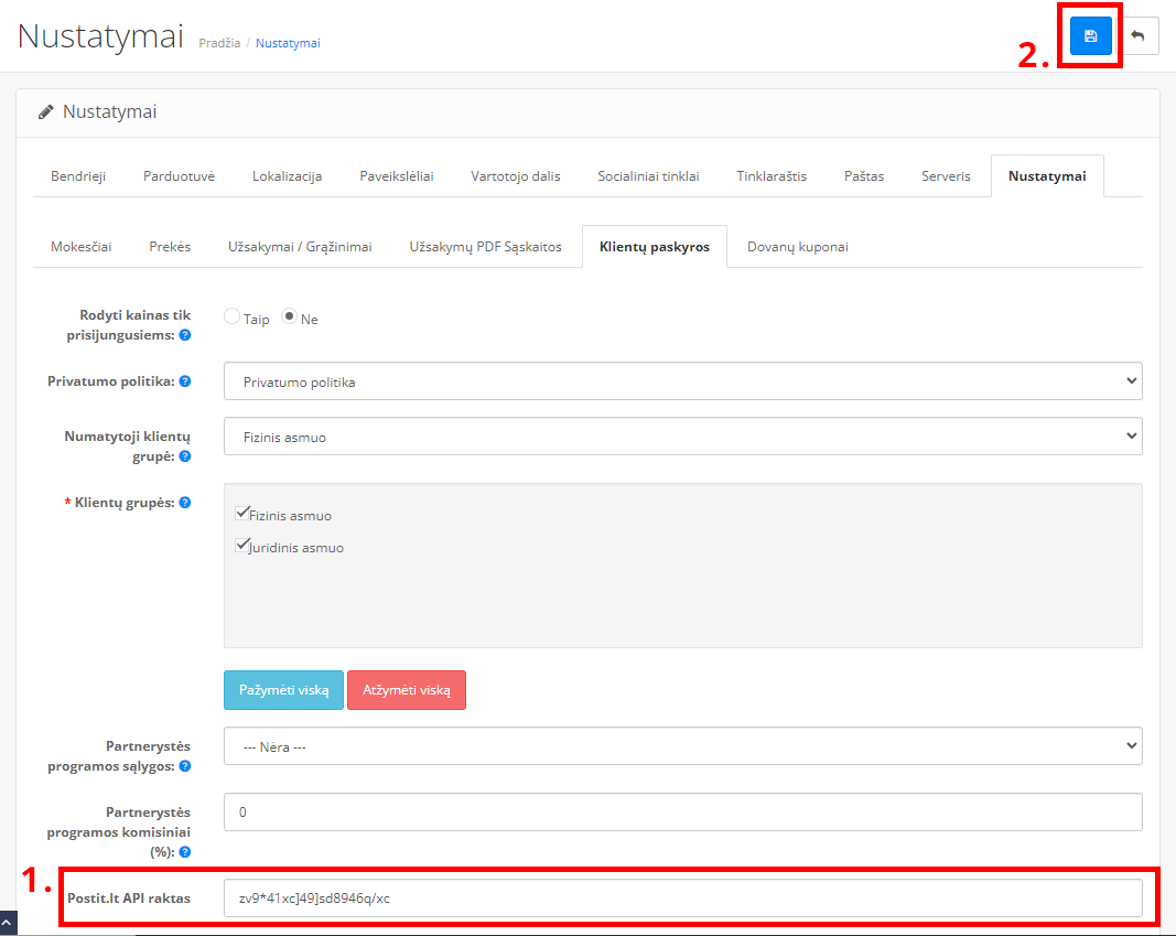 Turint postit.lt raktą keliaujame į Nustatymai > Pagrindiniai nustatymai > Nustatymai > Klientų paskyros skiltį. Čia, apačioje matysime laukelį postit.lt API raktas: