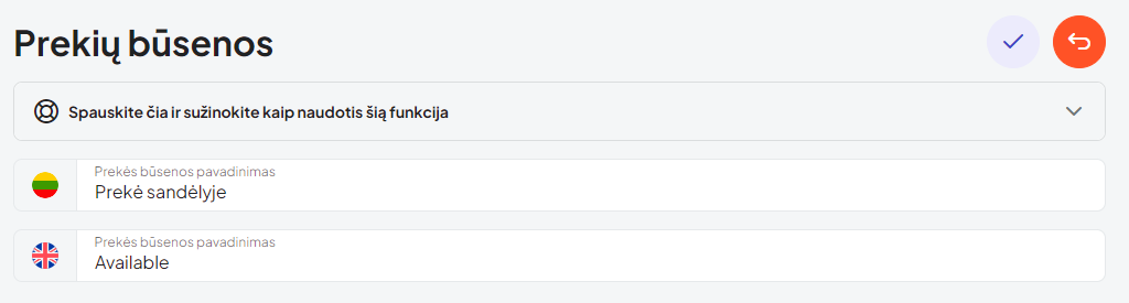 - Keičiant ar kuriant naują būseną, atsidariusiame lange užteks įrašyti norimą prekės būsena visomis, jūsų parduotuvėje naudojamomis kalbomis.
