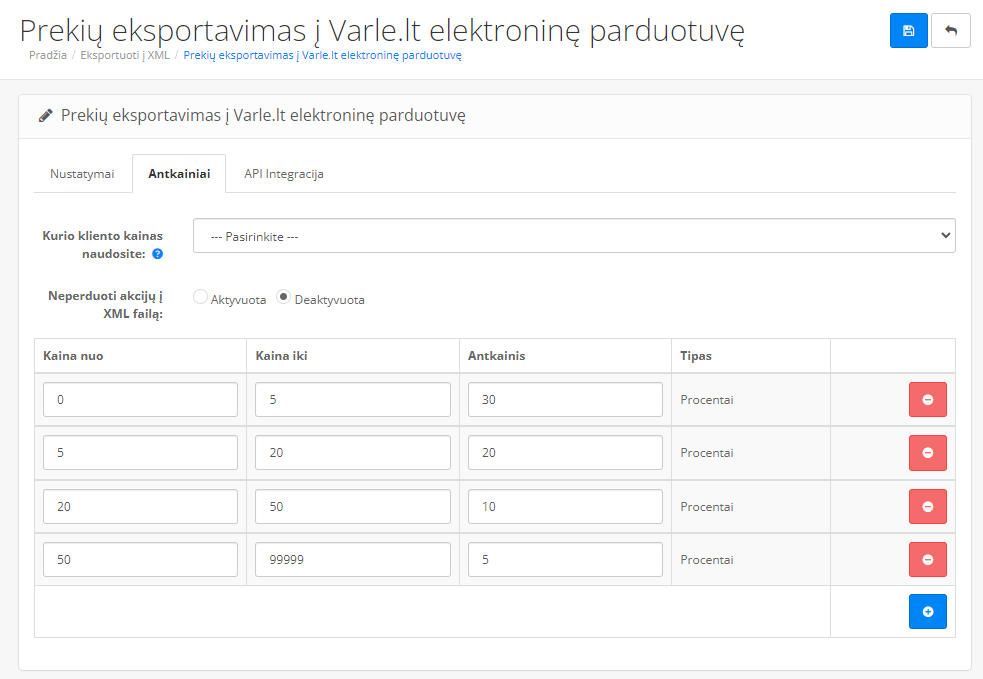 - Apačioje esančioje lentelėje galite suvesti savo norimus antkainius, norint pridėti naują antkainio eilutę – spauskite apatiniame lentelės dešiniajame kampe esantį mėlynos spalvos pridėjimo mygtuką su pliuso simboliu. Norint pašalinti antkainio eilutę – spauskite kiekvienos eilutės šone esantį raudonos spalvos ištrynimo mygtuką su minuso simboliu.Suvedami antkainiai turi prasidėti ir baigtis tuo pačiu skaičiumi, negalima palikti tarpų tarp skaičių. Pavyzdžiui jei turime antkainį nuo 1 iki 10 eurų, o sekantis turėtų būti virš dešimties – vedame nuo 1 iki 10, o antrąjį – nuo 10 (tokiu atveju antrasis antkainis galios pvz. nuo 10.00001 eur.