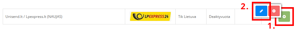 Pristatymo būduose randame modulį Unisend / LP Express integracija (nauja). Jei integracija dar nė karto nebuvo naudota aktyvuojame žaliu mygtuku su pliuso simboliu [1.], vėliau įjungiame redagavimą / valdymą mėlynu mygtuku su pieštuko simboliu [2.].