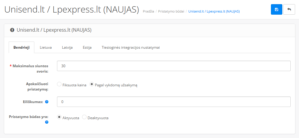 - Laukelis Pristatymo būdas yra turi būti pažymėtas kaip Aktyvuota kitaip būdas neveiks.