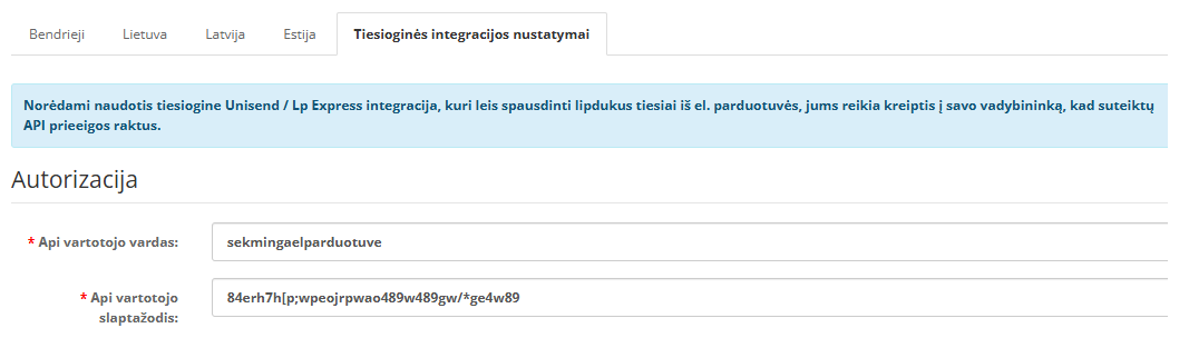 Norint naudotis integracija suvedame čia gautus iš savo Unisend vadybininko – skirtus prisijungimo duomenis