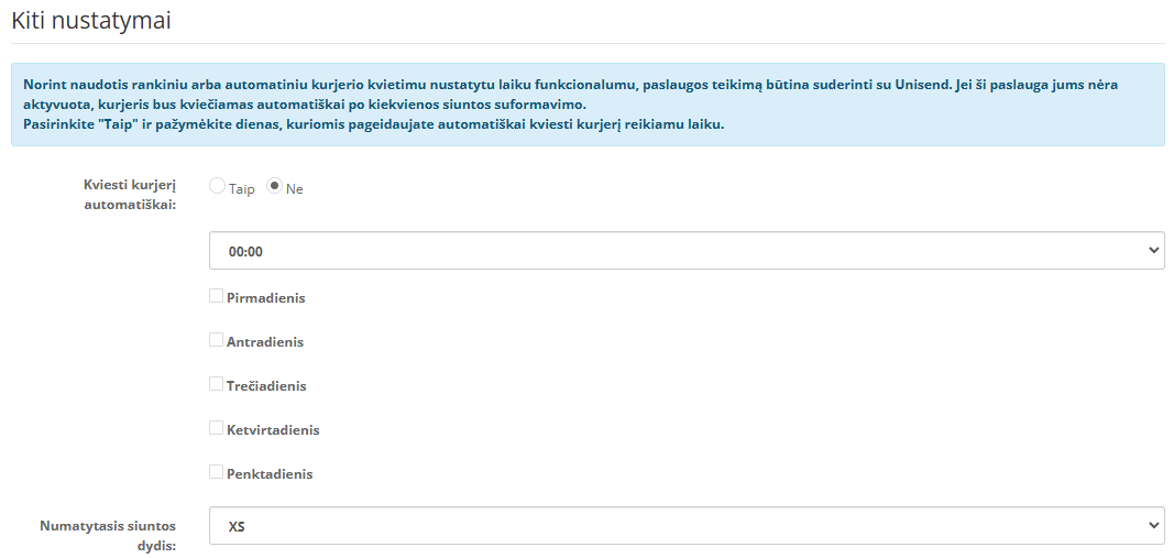 - Maksimalus siuntos svoris – įvesti privaloma, įveskite sveiką skaičių kilogramais, pagal savo paslaugų teikimo sutartį arba teiraukitės jus aptarnaujančio vadybininko.