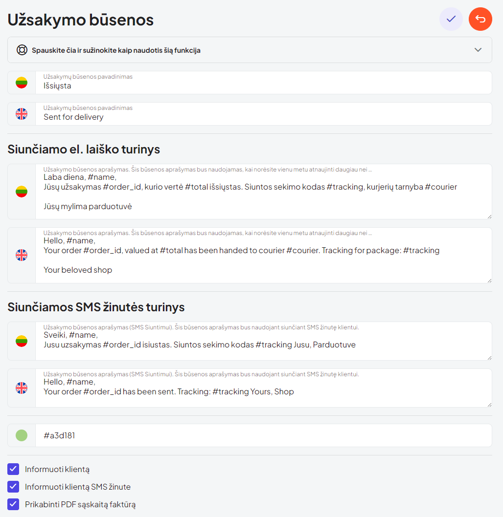 Siunčiamo el. laiško turinys – suveskite tekstus visomis kalbomis, kuriuos tam tikra būsena automatiškai nusiųs klientams laišku, kai užsakymui nustatysite šią būseną;
