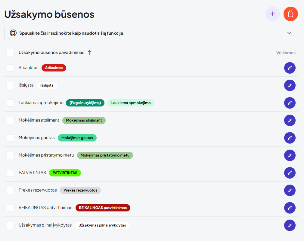 Naujoje parduotuvėje reikalingiausios būsenos jau būna sukurtos ir paruoštos naudojimui, tačiau visada galite pridėti savo. Ypač rekomenduojame būsenose suvesti išankstinius tekstus - jie automatiškai prisidės užsakymuose kiekvieną kartą, taip pateikdami tiek naudingą informaciją klientams taip ir sukurdami geresnį ryšį su jais, o jums papildomai nereikės nieko rašyti.