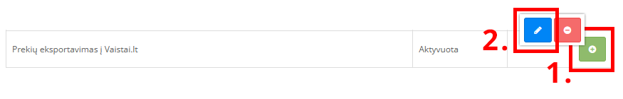 Jei integracija nebuvo naudota ją aktyvuokite [1] žalios spalvos mygtuku su pliuso simboliu ir spauskite redaguoti – mėlynos spalvos mygtuką su pieštuko simboliu [2].