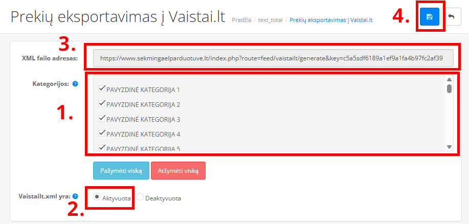 Įjungus integracijos redagavimą matysite valdymo langą – duomenų čia nedaug, reikės tik įjungti integraciją [2], pažymėti kurių kategorijų prekes norite matyti [1] atiduodamas į vaistai.lt portalą, nusikopijuoti nuorodą [3] ir išsaugoti [4].