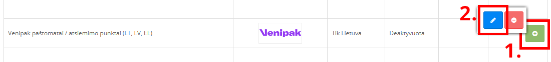 Norint naudotis Venipak paštomatais, jums reikia aktyvuoti pristatymo modulį. Tai galite padaryti skiltyje: Nustatymai > Pristatymo būdai. Atsivėrusiame lange pasirinkite pristatymo modulį: Venipak paštomatai / atsiėmimo punktai (LT, LV, EE). Jeigu modulis yra dar neįdiegtas, tokiu atveju spauskite įdiegimo mygtuką (žalias su pliusiuku), kitu atveju redagavimo mygtuką (mėlynas su pieštuku).