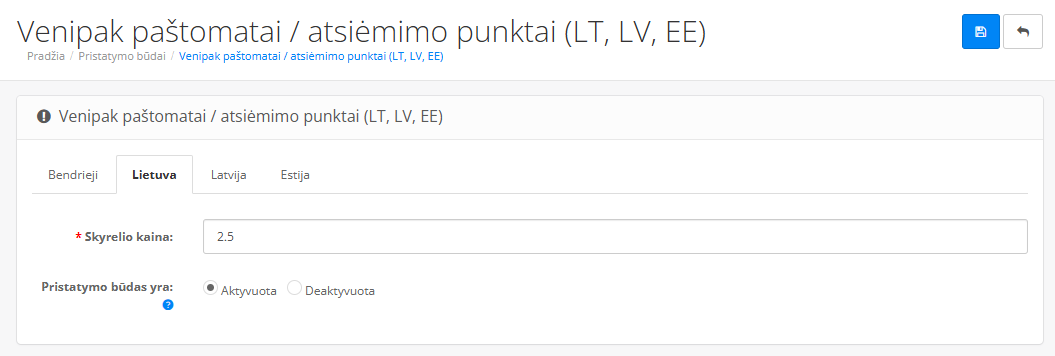 Kadangi pačią integraciją padarėte anksčiau, čia užteks tik aktvyuoti modulį ir suvesti skirtingas kainas norimoms naudoti paštomatų pasirinkimo šalims.